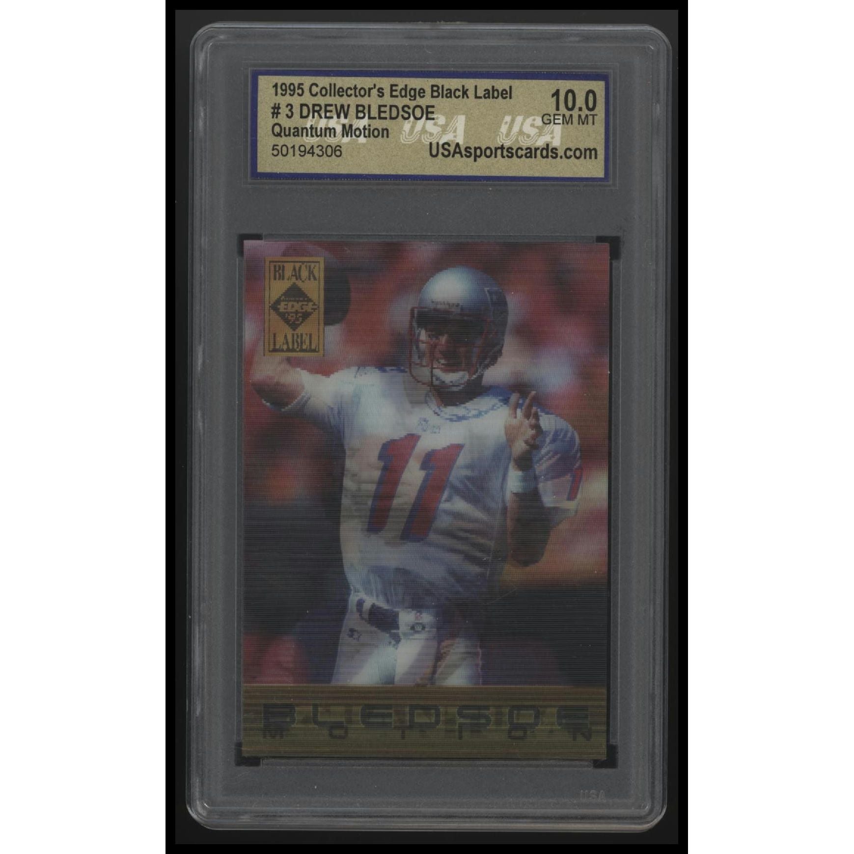This is a nice example of a 1995 Collector's Edge #3 Drew Bledsoe Black Label Quantum Motion Promos Other important information about this card:Other 10 1In 1995 Drew Bledsoe played for the New England Patriots.Please check out our other listings for more great cards.
