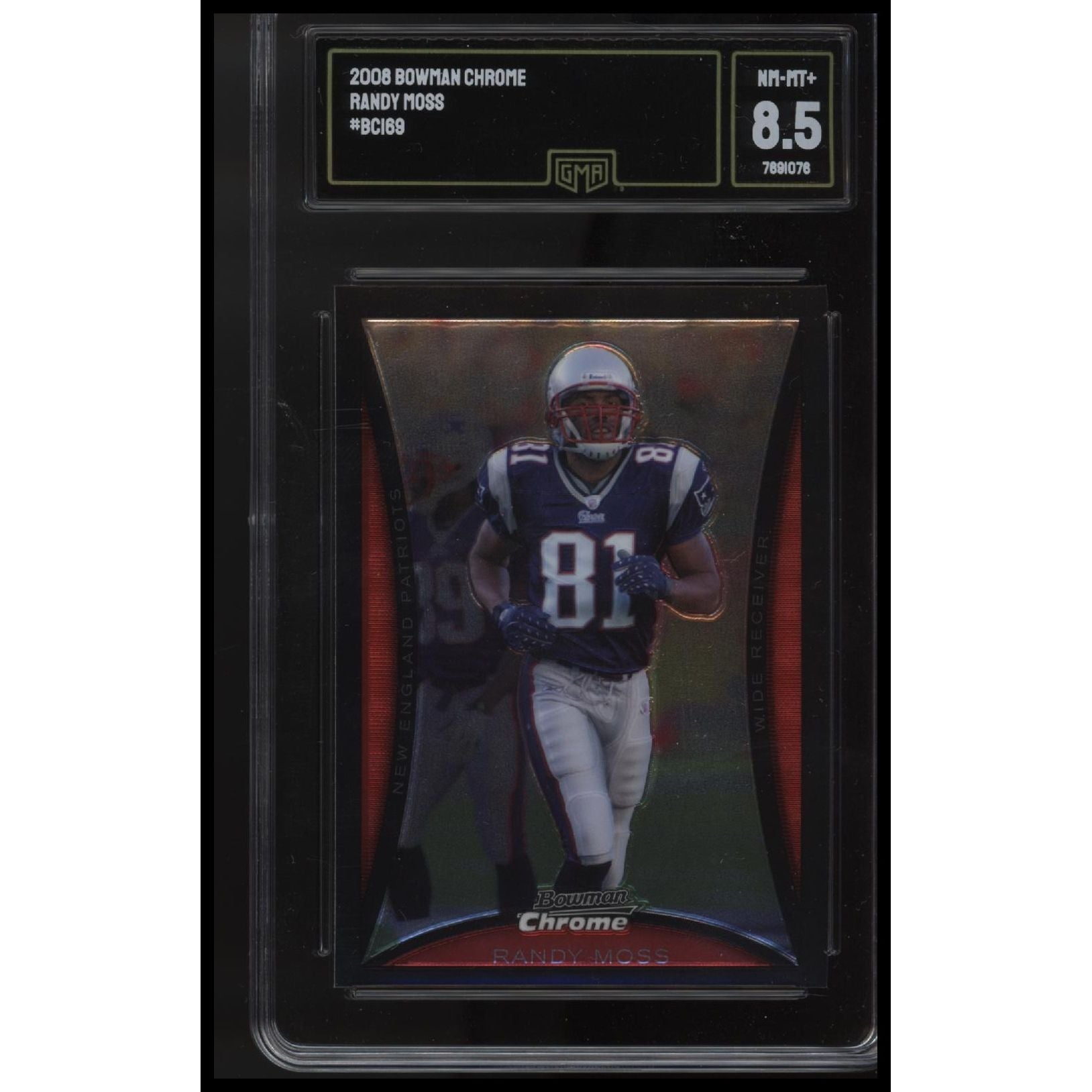 This is a nice example of a 2008 Bowman Chrome #BC169 Randy Moss Other important information about this card:GMA 8.5 1In 2008 Randy Moss played for the New England Patriots.Please check out our other listings for more great cards.