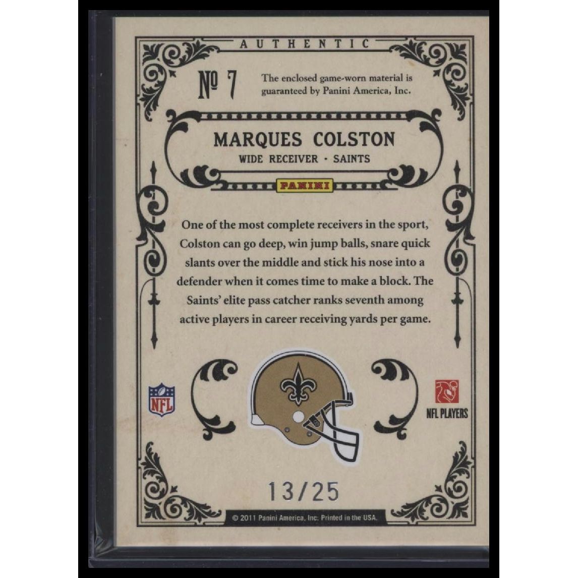 This is a nice example of a 2011 Panini Gold Standard #7 Marques Colston Gridiron Gold Materials Prime Other important information about this card:SN,MEMIn 2011 Marques Colston played for the New Orleans Saints.Please check out our other listings for more great cards.